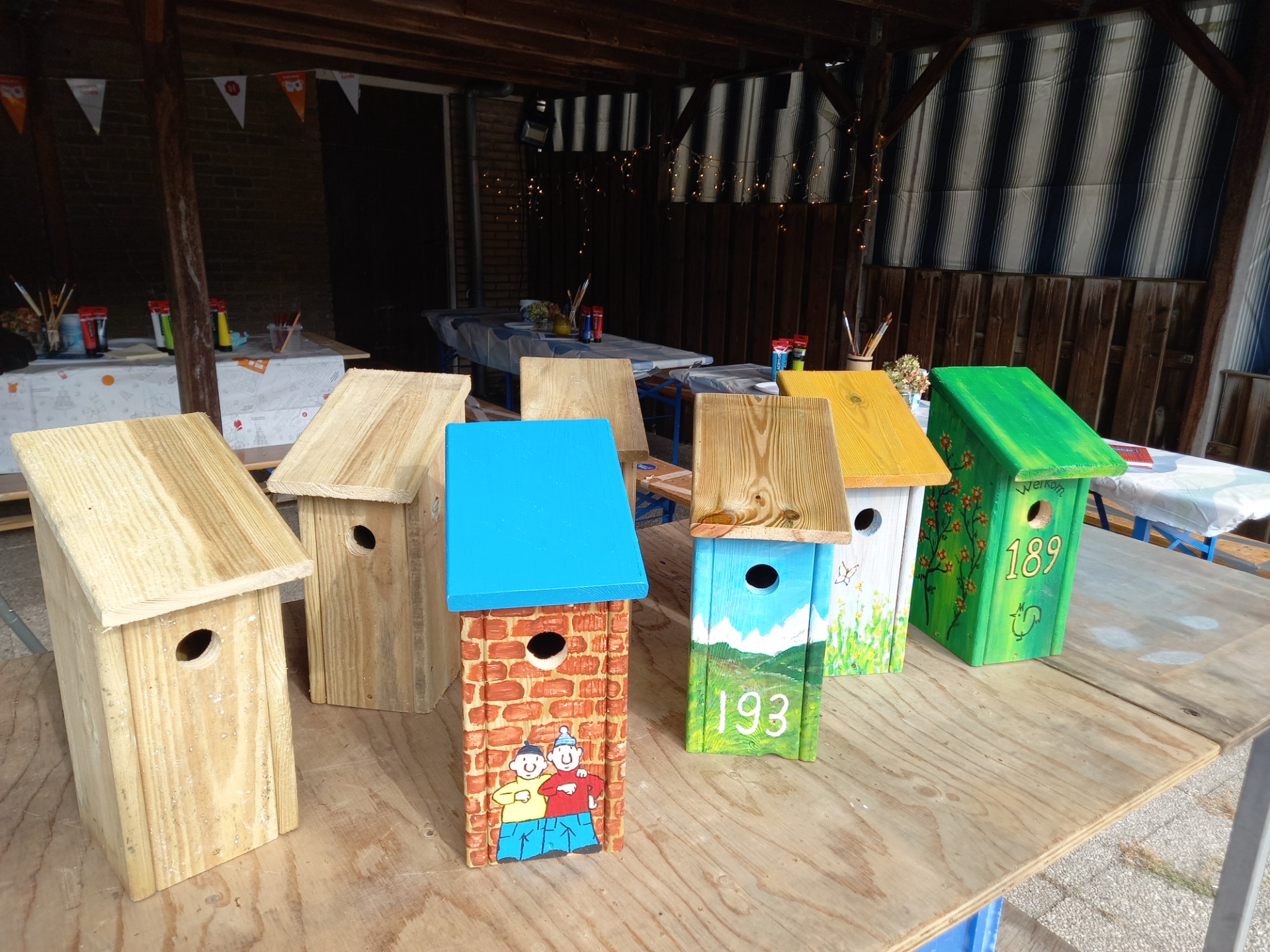 Je pimpt een nestkastje naar eigen idee. Er zijn ook voldoende voorbeelden aanwezig. Voor nestkastjes en verfmateriaal wordt gezorgd.
