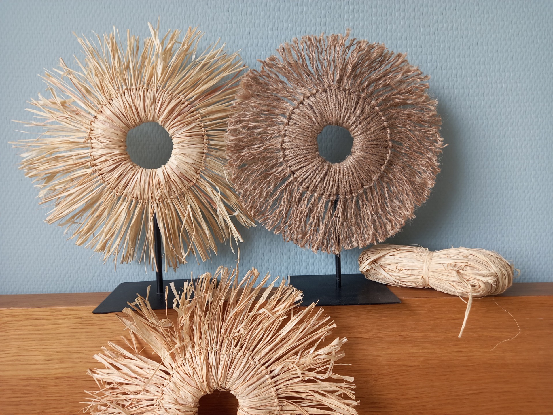 Een leuk ornament van raffia, in boho stijl. Eenvoudig om te knopen met een mooi natuurlijk resultaat. Je kunt hem op een standaard vastzetten of er voor kiezen om hem op te hangen.