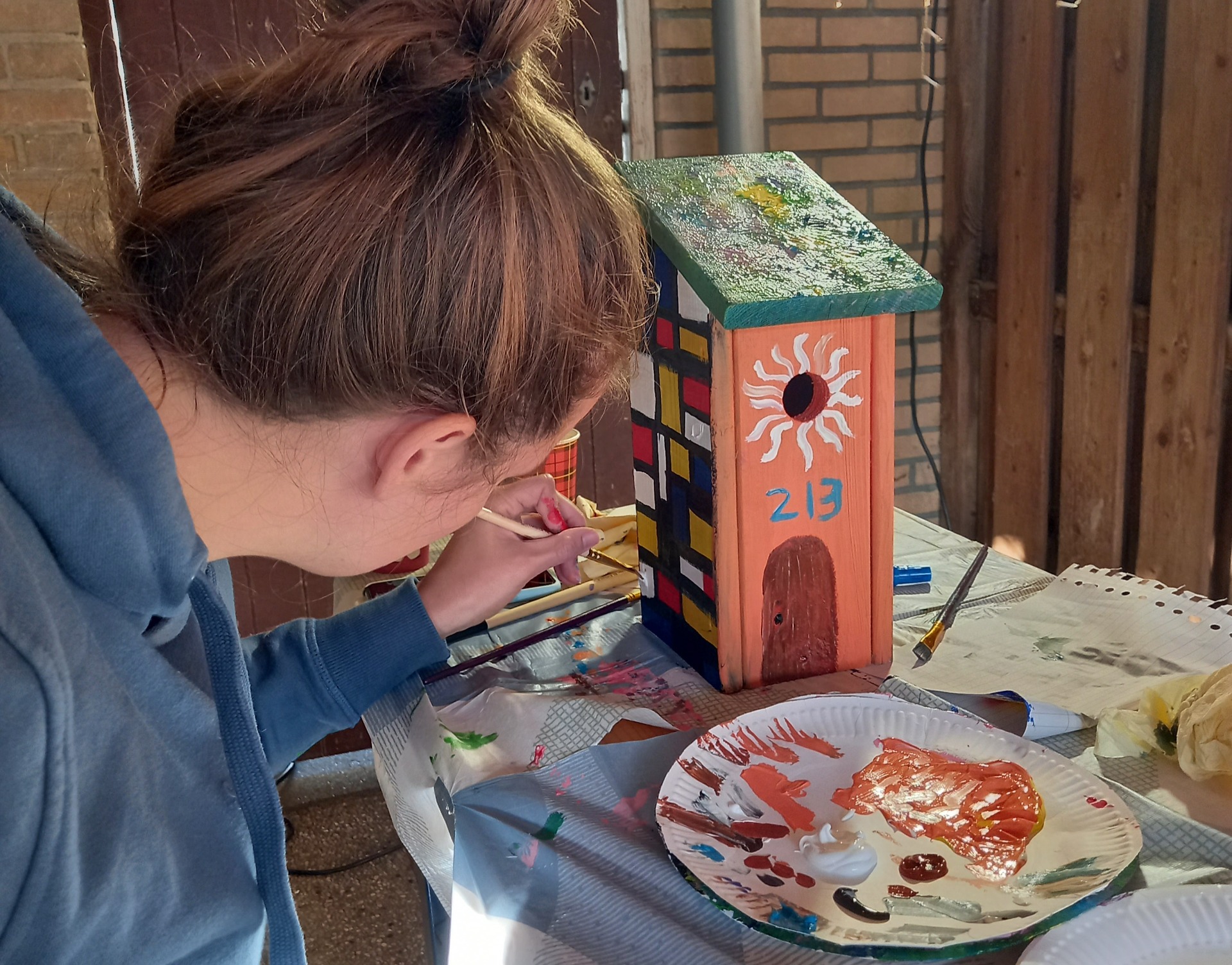Je pimpt een nestkastje naar eigen idee. Er zijn ook voldoende voorbeelden aanwezig. Voor nestkastjes en verfmateriaal wordt gezorgd.