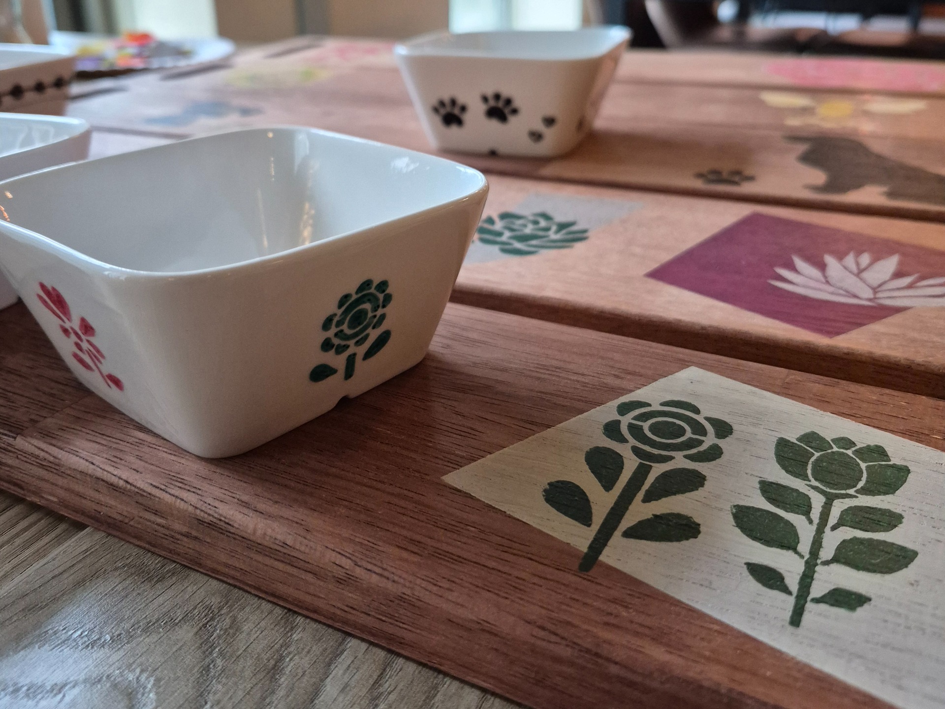 Voor de schaaltjes worden porselein stiften gebruikt. Voor de plank acrylverf. Uiteraard zijn er voorbeelden aanwezig, maar kom ook gerust met een eigen idee.